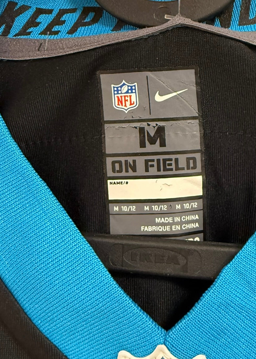 Black jersey with blue and white details from the Carolina Panthers. Size M, fits like a S for a more fitted look. Clean, sporty design with a versatile unisex fit – easy to style casual or as a statement streetwear piece.